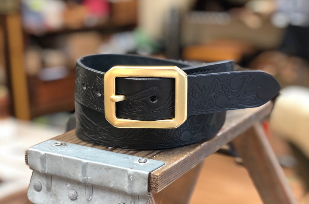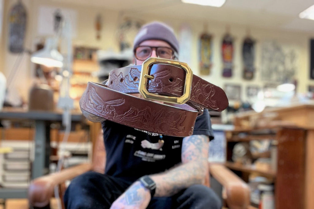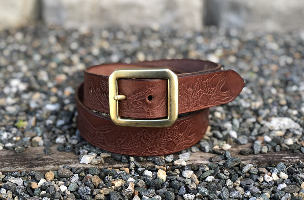 Belts are hand cut from a side of the finest American vegetable tanned leather. Once the belt blank is cut the leather edges are skived, sanded, and burnished to create a strong durable edge that looks great and will stand the wear and tare you'll throw at it for a lifetime of wear.