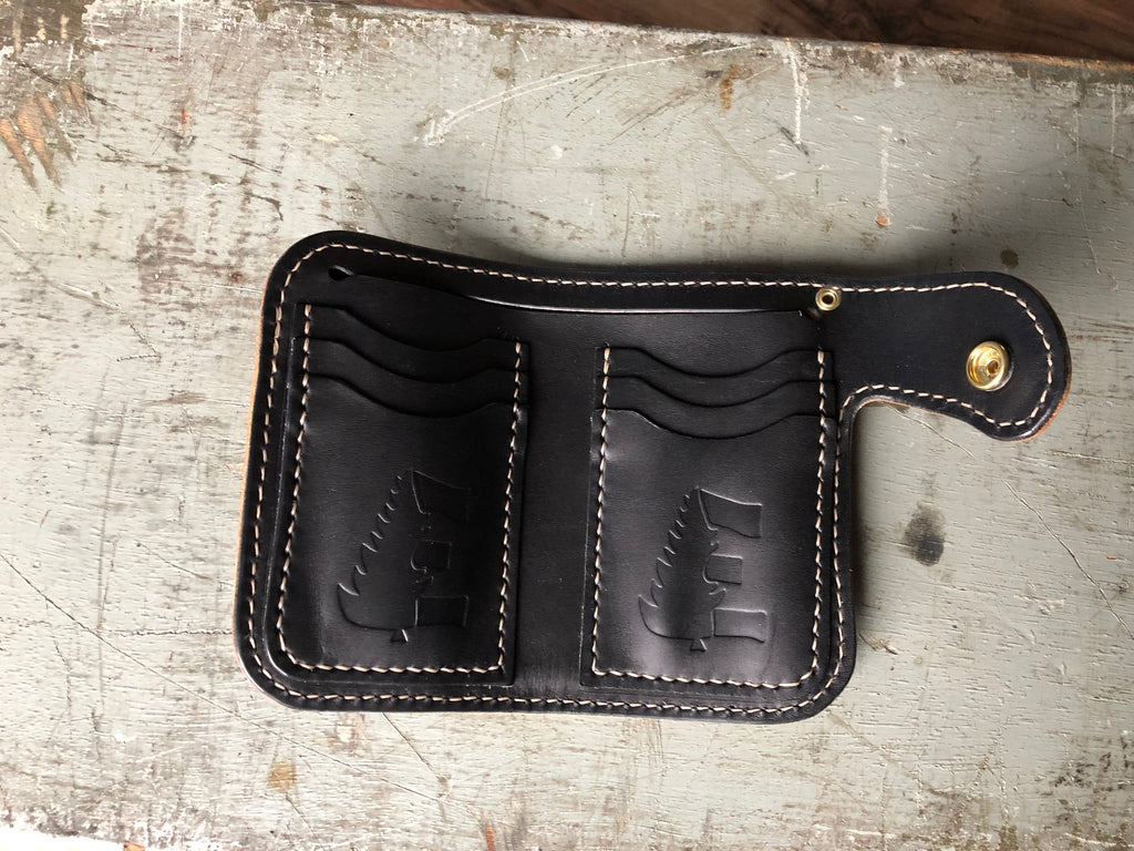 Wallet is hand cut, hand sewn, stamped with the 'Tree E', and the edges beveled and burnished to a beautiful glass like look.