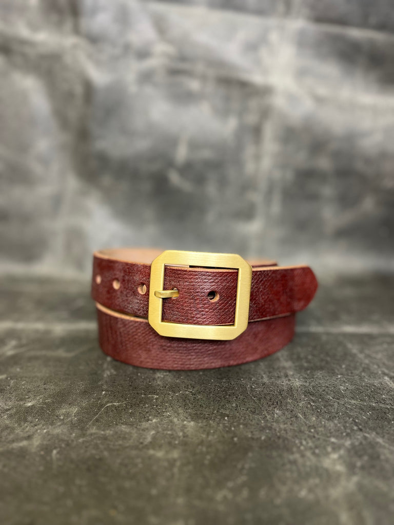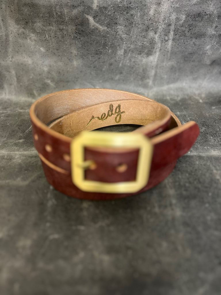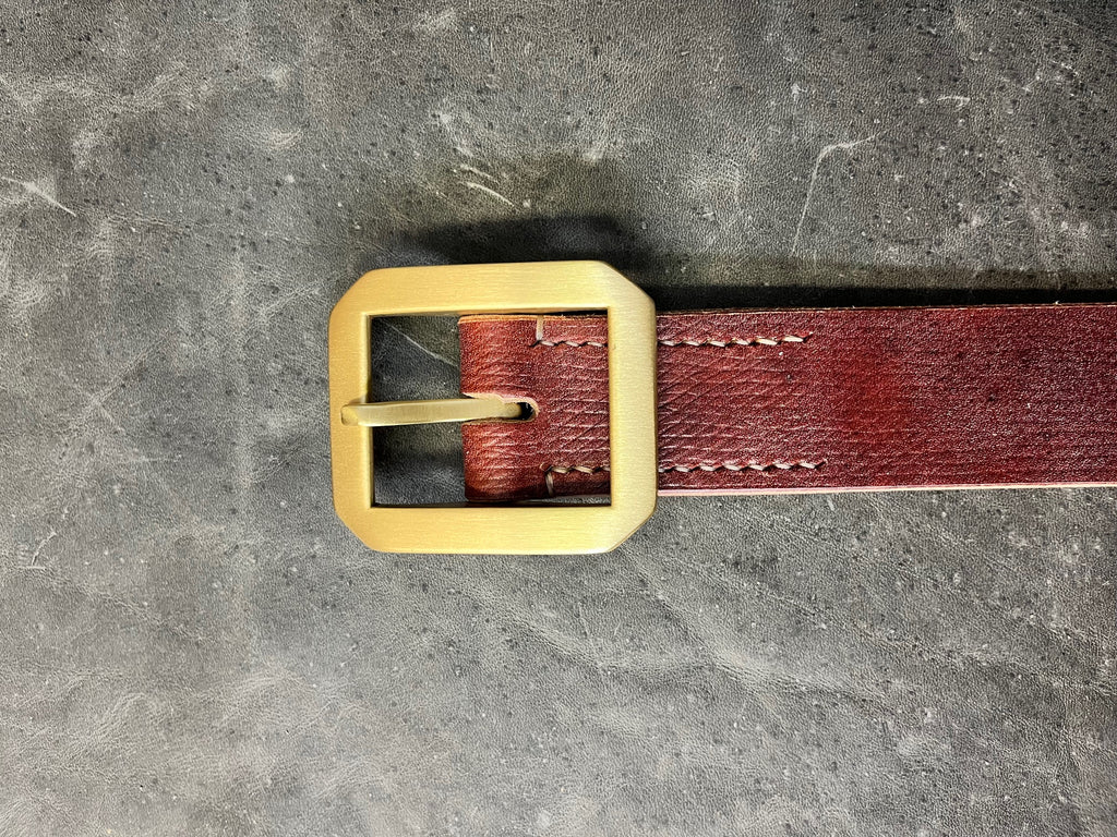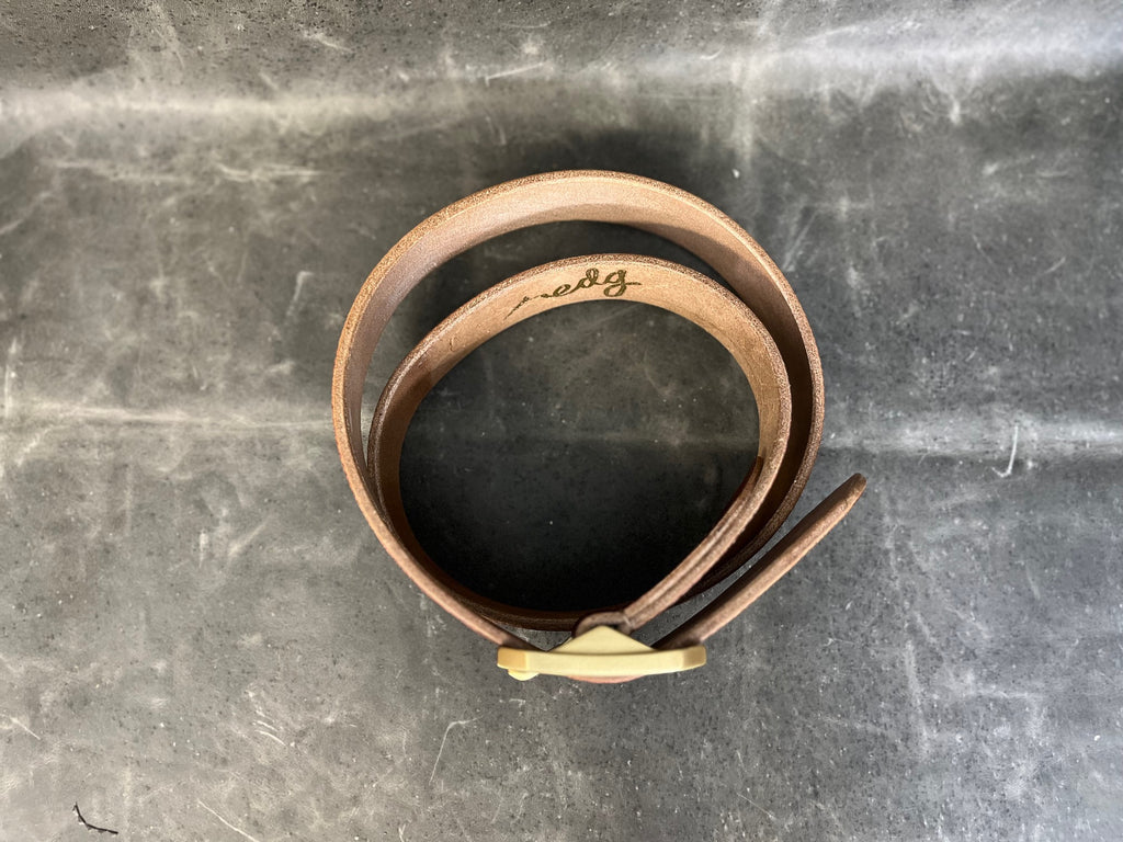 Made from 14 oz. natural oak bark tanned bridle leather from Brittan's only remaining oak bark tannery.  The Oak Bark Belt is equipped with the thickest Japanese brass buckle we can get our grubby little hands on.