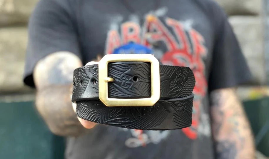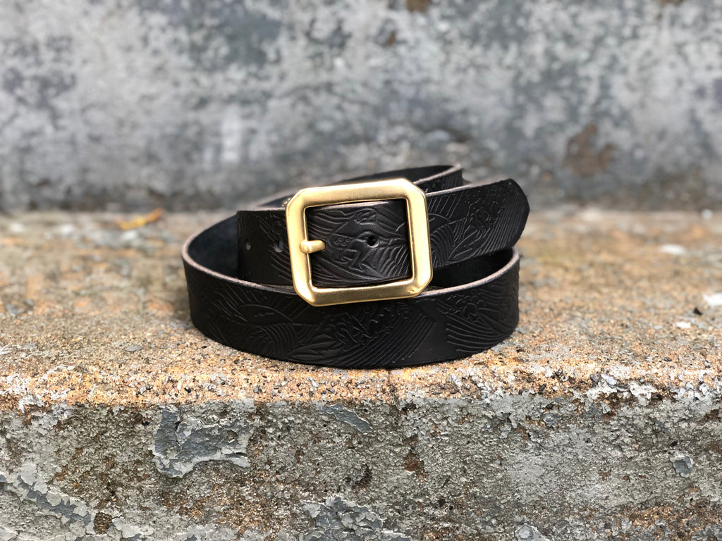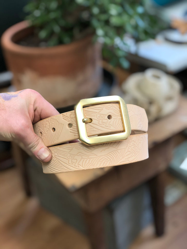The newest in our revived classics from the Frontier Land archives is the 'Surf's Up' Belt. Made from a sturdy 11/12 oz Black American Veg tanned leather, stamped with vintage Disney Land's Frontier Land brass embossing plate and then a solid brass (we switched from the super thick buckle to this one to cut down on weight and bulk in the front of your pants) buckle is hand sewn on.
